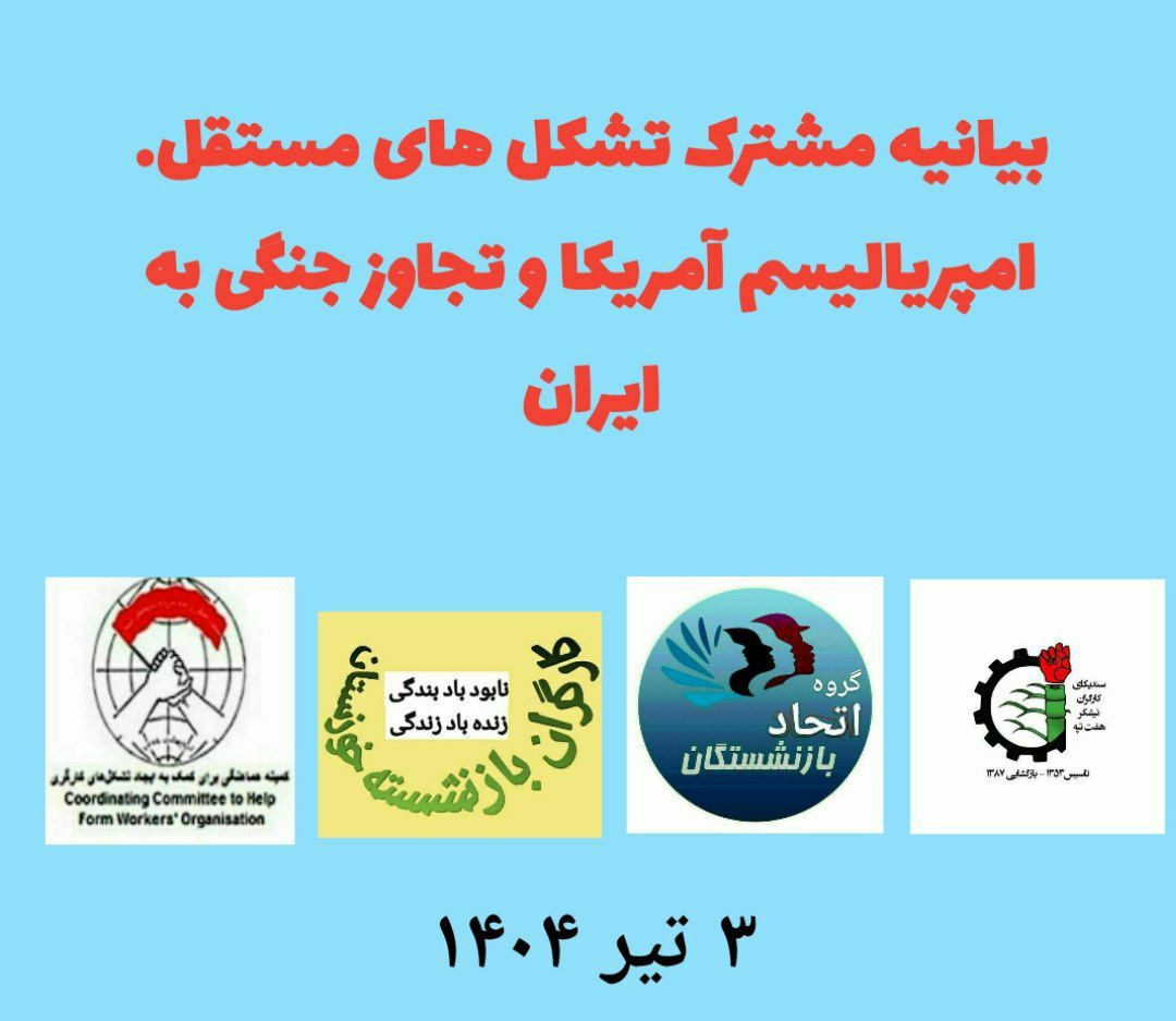 در پی حمله نظامی آمریکا به مراکز هستهای ایران، تشکلهای مستقل کارگری و اجتماعی با انتشار بیانیهای مشترک، این اقدام را تجاوزی آشکار با اهداف سلطهجویانه دانستند و تأکید کردند که این جنگ نه به نفع مردم ایران است و نه راهی به سوی آزادی.