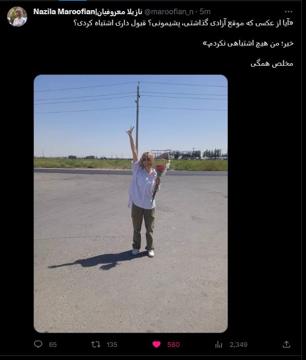 نازیلا معروفیان، روزنامهنگار که روز ۲۳ مرداد، یک روز بعد آزادی از زندان مجددا بازداشت شده بود، با انتشار تصویری بدون حجاب اجباری، از آزادی خود خبر داد.