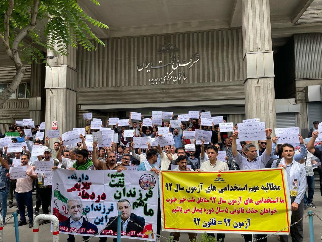 روز یکشنبه 14 اردیبهشت ماه کارکنان رسمی نفت ورودی های آزمون سال 92 به بعد در اعتراض به عدم توجه و رسیدگی به خواسته هایشان،تجمع بزرگی را در مقابل وزارت نفت برگزار کردند.