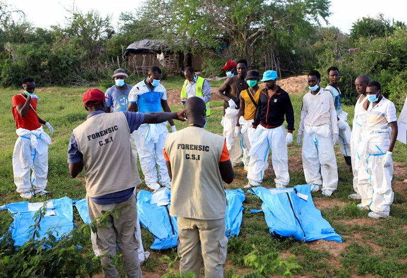 گفته می شود ۲۲ جسد جدید دیگر روز شنبه ۱۳ مه کشف شد. پلیس بر این باور است که اکثر اجساد پیدا شده در نزدیکی شهر ساحلی مالیندی متعلق به پیروان فرقه «پل مککنزی»، کشیش خودخوانده کلیسای بینالمللی «گودنیوز» است. پل مککنزی در تاریخ ۱۴ آوریل پس از اینکه پلیس جسد نخستین قربانیان را در جنگل شاکاهولا کشف کرد تسلیم مقامات شد. از آن زمان تاکنون حدود پنجاه گور دسته جمعی کشف شده است. در همین حال رئیس عملیات پزشکی قانونی گفته است که برخی از قربانیان از جمله کودکان بر اثر خفگی و ضرب و جرح جان باختهاند.