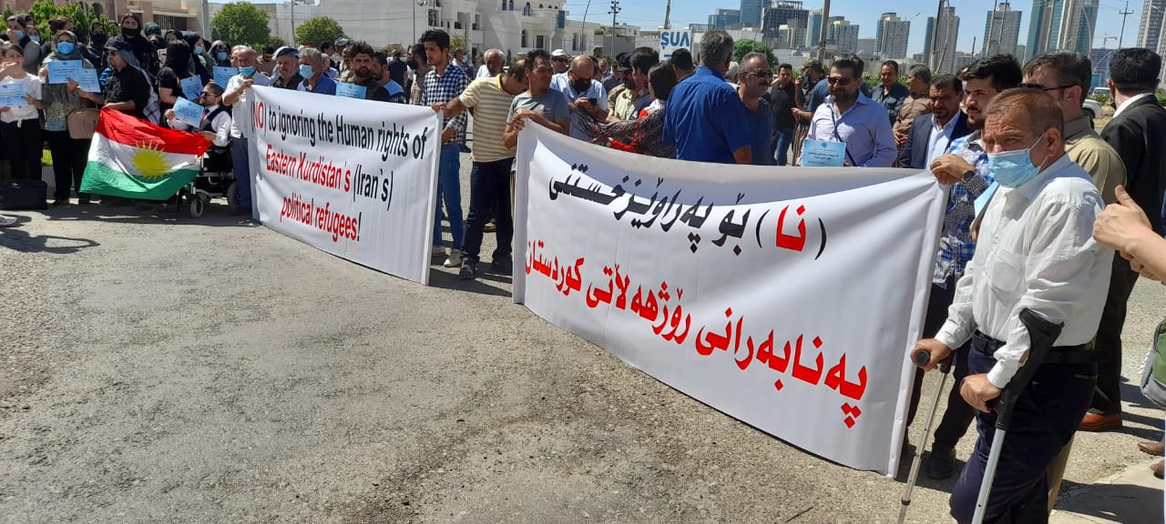 در این تجمع، حاضرین نسبت به بی توجهی مقامات کمیسیاریای عالی پناهندگان در خصوص وضعیت پناهجویان ساکن کردستان عراق و همچنین بی توجهی به وضعیت سلامت بهزاد محمودی که روز سه شنبه 28 اردیبهشت ماه در اعتراض به وضعیت نامناسب پناهجویان و عدم پاسخگویی به آنان، اقدام به خودسوزی نمود، دست به اعتراض زدند. گفتنی است در این تجمع مهدی مولانایی به عنوان نماینده کومه له در اربیل نیز حضور داشت. بهزاد محمودی چهار سال قبل مدارک مربوط به درخواست پناهندگی را تکمیل کرد اما از آن زمان تاکنون مدارکش بررسی نشده است.