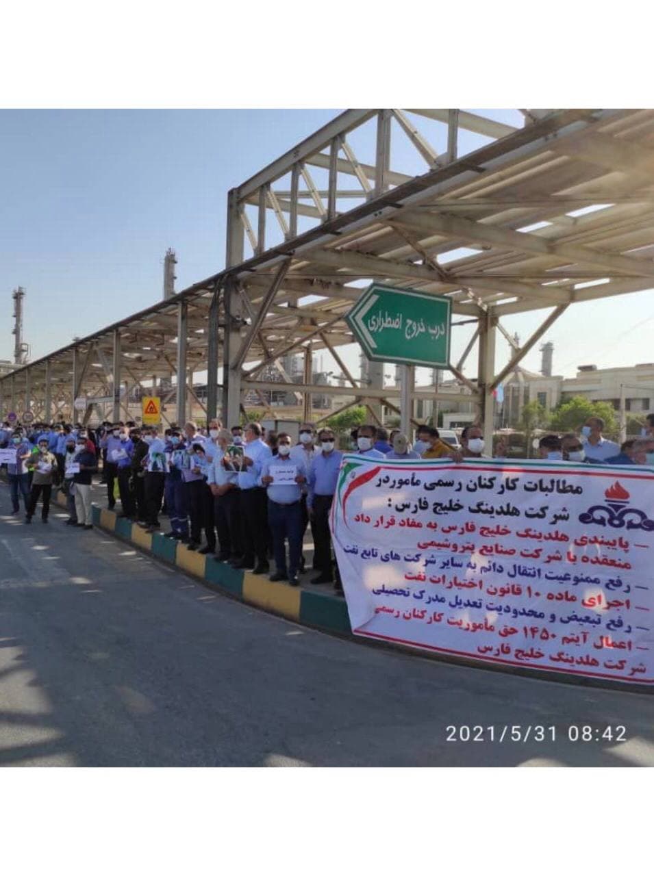 روز سه شنبه 11 خرداد ماه برای چندمین روز متوالی جمعی از کارگران وکارکنان رسمی نفت هُلدینگ خلیج فارس در اعتراض به عدم اجرای ماده 10 قانون نفت در مقابل سایت 4 اقدام به برگزاری تجمع کردند.