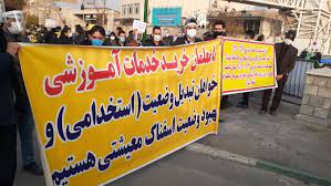 جمعی از فرهنگیان خرید خدمت از جمله مربیان پیش دبستانی روز سه شنبه 4 خرداد ماه همزمان با جلسه علنی مجلس مقابل ساختمان مجلس رژیم تجمع کردند.