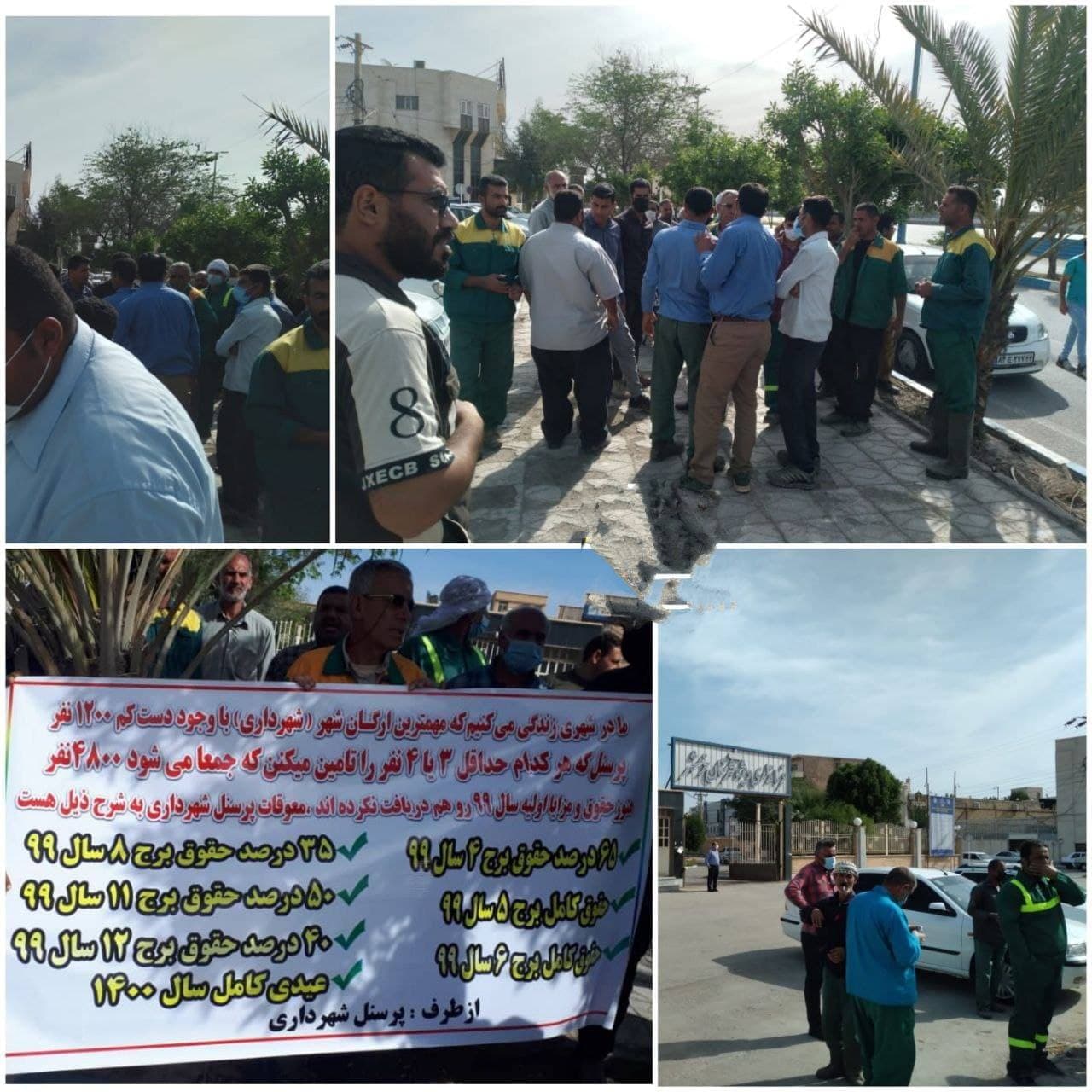 جمعی از کارگران شهرداری خرمشهر، روز شنبه ۲۸ فروردین ماه، در اعتراض به عدم رسیدگی به مطالباتشان، در مقابل ساختمان فرمانداری این شهر، دست به تجمع زدند.