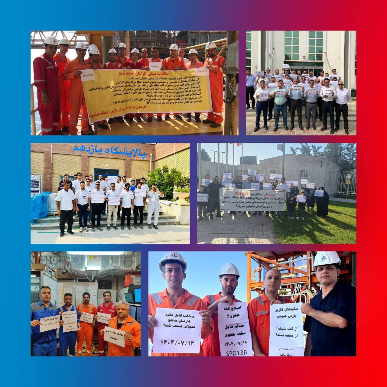 این اعتراضات در نقاط مختلفی از جمله شرکت نفت و گاز پارس (عسلویه)،سکوی دریایی پارس جنوبی، سازمان منطقه ویژه اقتصادی انرژی پارس، مجتمع گازی پارس جنوبی، پالایشگاه یازدهم و سکوهای دریایی شرکت نفت و گاز پارس برگزار شده است.معترضان با در دست داشتن پلاکاردهایی خواستار تحقق مطالبات صنفی و شغلی خود شدند.اصلاح نظام حقوق و دستمزد،پرداخت کامل حقوق،حذف کسورات ناعادلانه،اجرای قراردادهای استخدامی،لغو سقف حقوق،اجرای کامل ماده ۱۰ قانون وظایف و اختیارات وزارت نفت و لغو تفکیک مشاغل به تخصصی و پشتیبانی در مناطق عملیاتی از مهم‌ترین خواسته‌های آن‌هاست.
