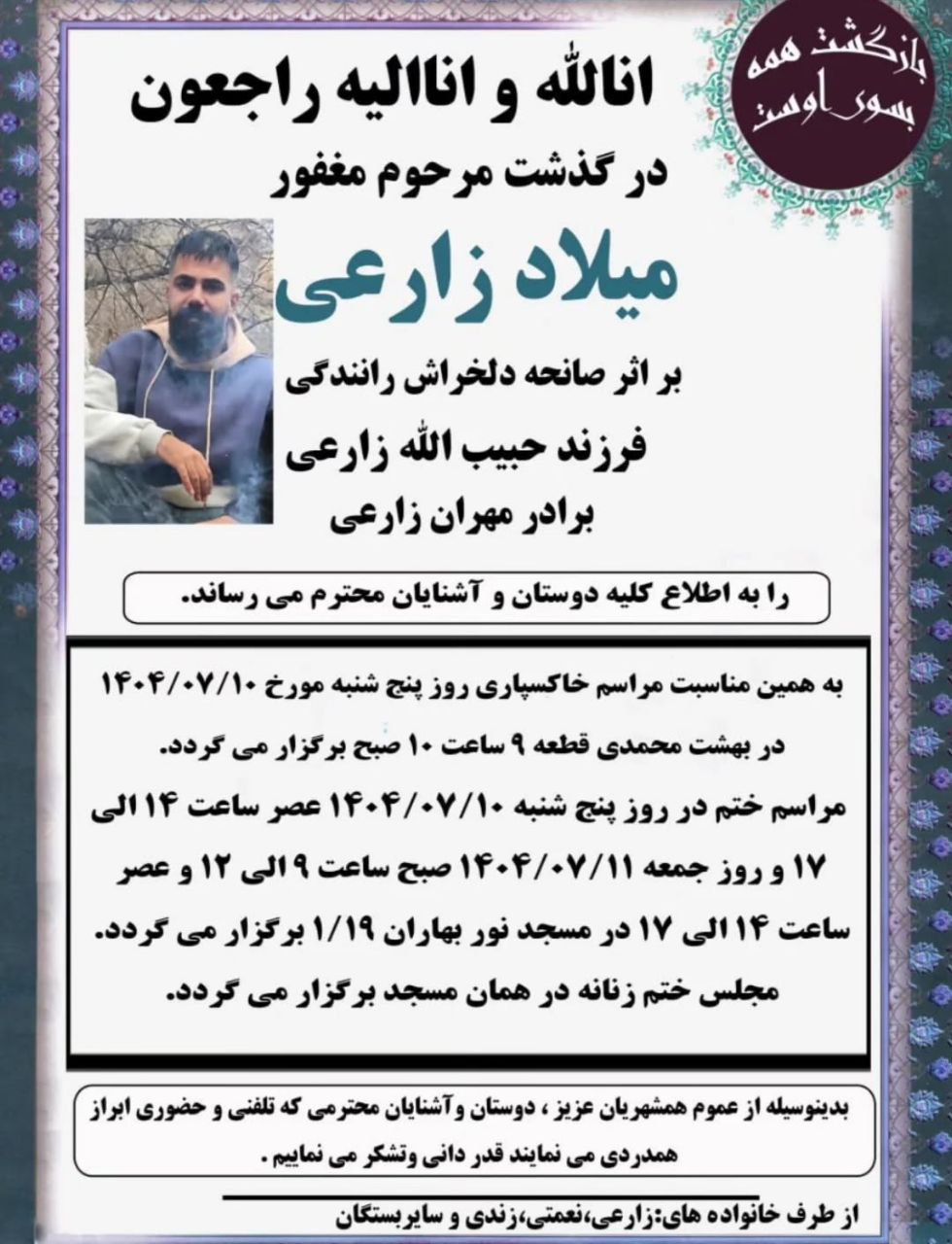 برپایه گزارش دریافت شده،روز پنج‌شنبه ۱۰ مهرماه میلاد زارعی از جوانان انقلابی و از مجروحان خیزش ژینا امینی در اثر سانحه رانندگی در شهر سنندج جان باخت.