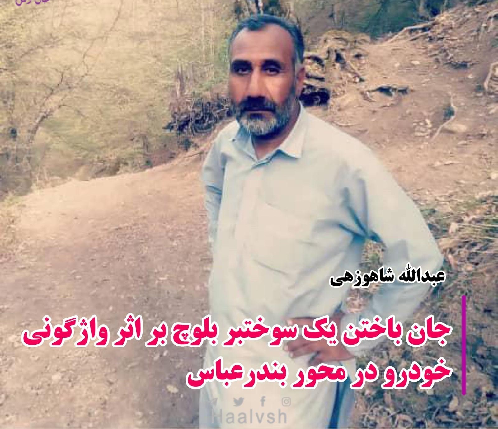 به نقل از حالوش، ، یک سوختبر بلوچ در بک سانحه جادهای بر اثر انحراف از مسیر جاده و واژگون شدن خودرو در محور بندرعباس، به شدت مجروح شده و پس از انتقال به بیمارستان این شهر، جان خود را از دست داد.هویت این سوختبر، “عبدالله شاهوزهی”۵۰ ساله، متاهل و دارای۱۱ فرزند، اهل زاهدان ساکن مازندران گزارش شده است.